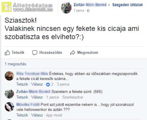 Babonából fekete macskát halloween idejére? Egyre durvábbak a fekete macskák körű húzott hiedelmek... Az Orpheus Állatvédő Egyesülethez több jelzés is érkezett, miszerint közösségi oldalakon, állatmenhelyeknél, állatvédő szervezeteknél halloween idején megnövekszik a kereslet a fekete macskák iránt. Seres Zoltán, az állatvédő szervezet vezetője arra kéri a szervezeteket, cicamentőket, fekete cicáknak gazdát kereső lakosságot, hogy csak felelős gazdijelöltek számára adjanak örökbe állatokat.
